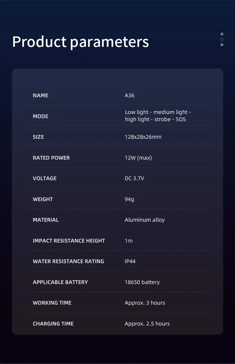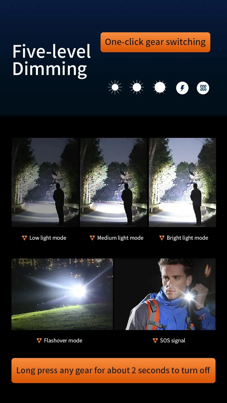 | Lighting Mode | Low Light - Medium Light - High Light - Strobe - SOS | ||