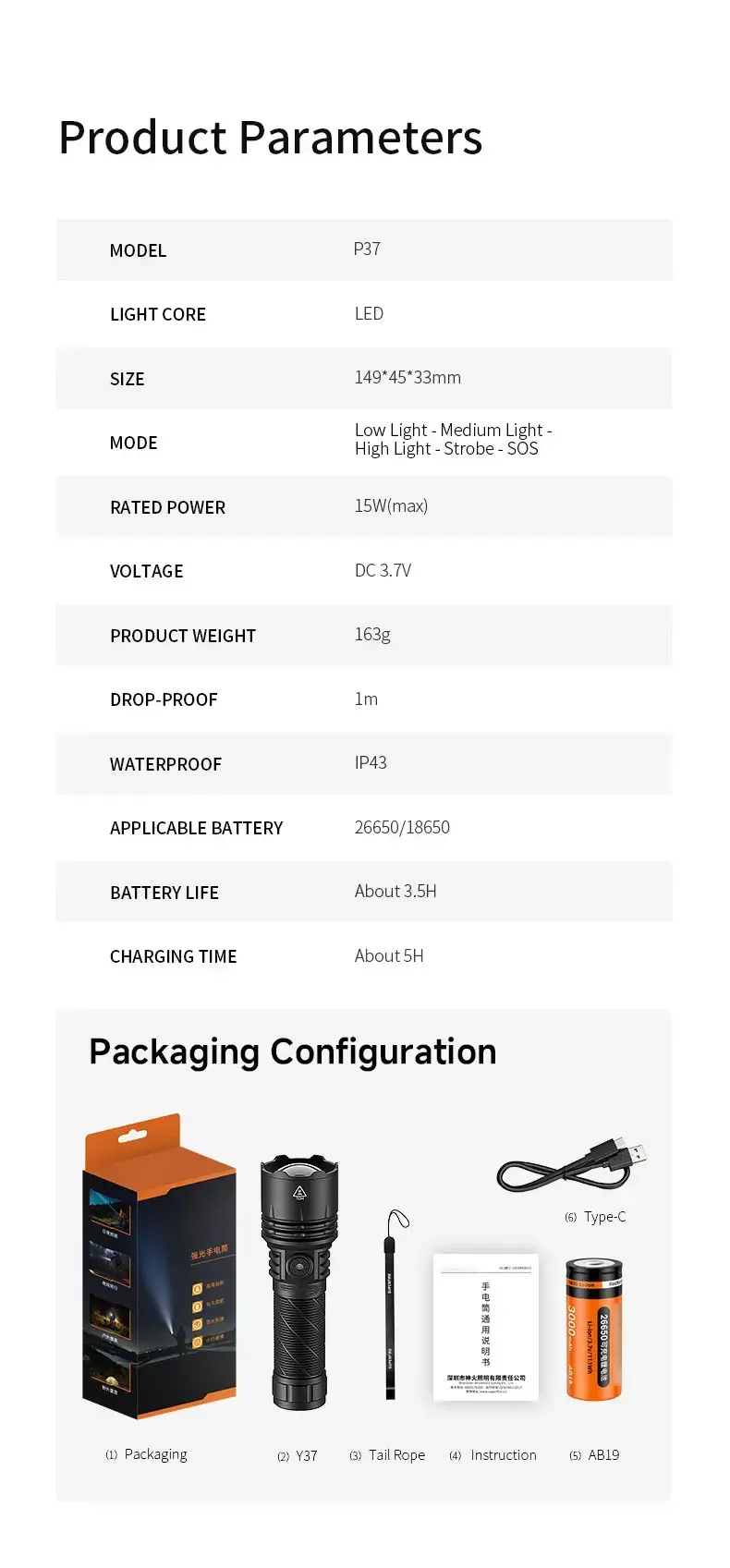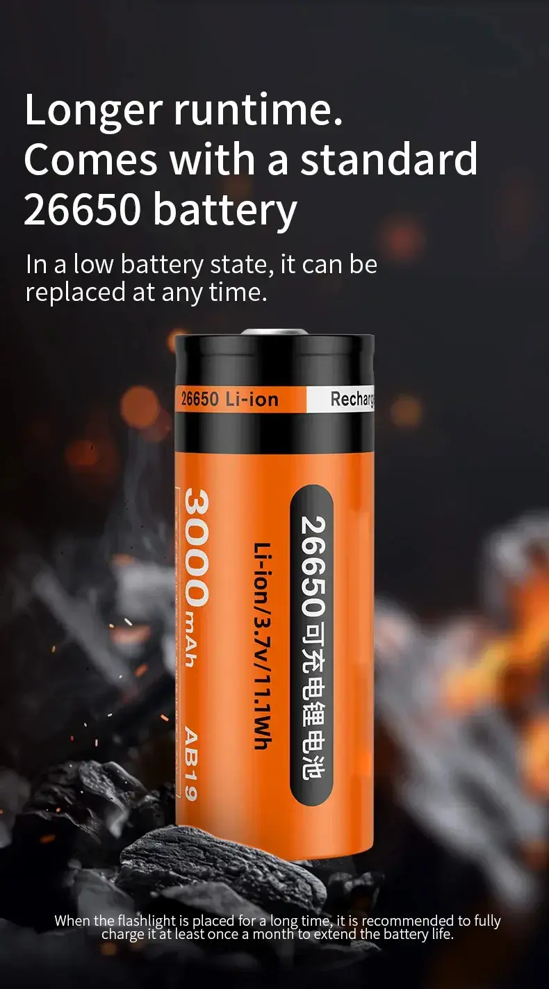 | Battery | 26650 Li-ion, 3000mAh | Runtime | Approx. 3.5 hours (on High) |