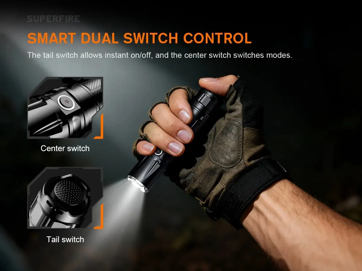 switch for ON/OFF, side button for mode selection |