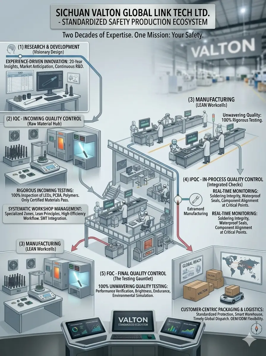 Quality is not an accident; it is the result of standardized processes. At our Xinjin, Chengdu manufacturing base, Sichuan Valton Global Link Tech Ltd. operates a high-precision production environment where every Aviation Marshalling Wand and Warning Light is crafted to meet international excellence.